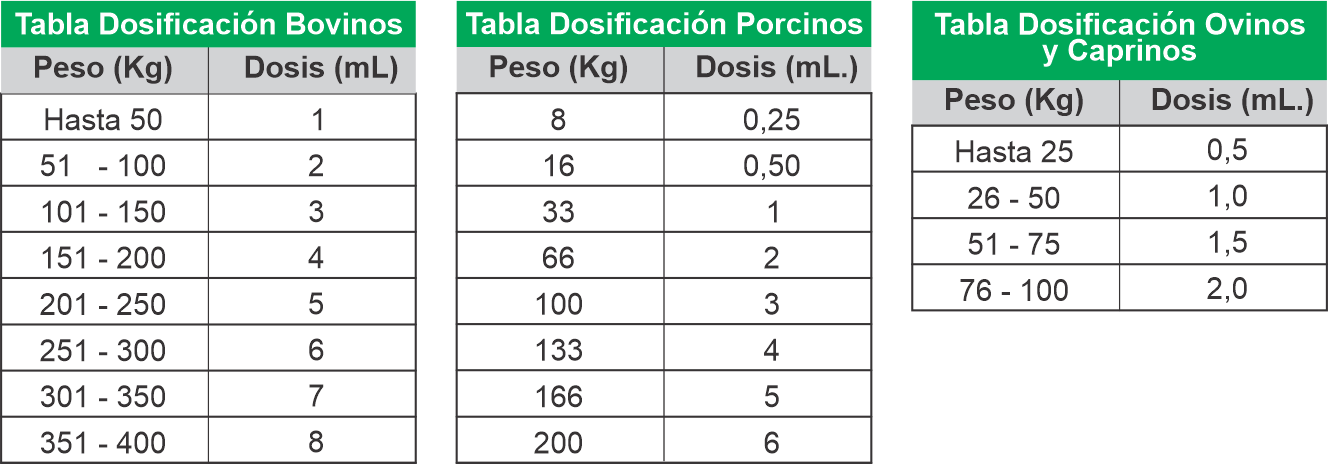 Bovinos: 1 mL por cada 50 kg de peso vivo. (Corresponde a 200 mcg de Ivermectina por kg de peso), Ovinos y Caprinos: 0,5 mL por cada 25 kg de peso vivo. (Corresponde a 200 mcg de Ivermectina por kg de peso), Porcinos: 1 mL por cada 33 kg de peso vivo. (Corresponde a 300 mcg de Ivermectina por kg de peso) (ver tabla de dosificación).