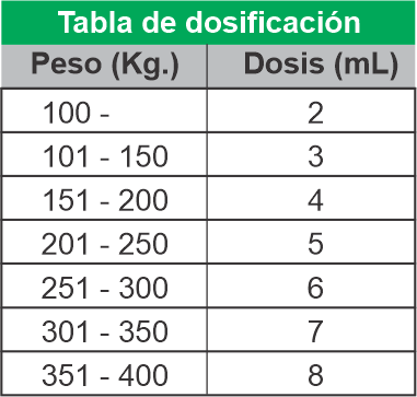 1 mL por cada 50 kg de peso vivo. (Ver tabla de dosificación). La dosis puede ser repetida a los 20 a 30 días del primer tratamiento.
