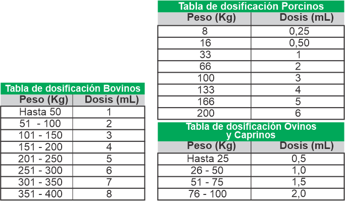 Bovinos, ovinos y caprinos: 1 mL por cada 50 kg de peso vivo (correspondiente a 200 mcg de Ivermectina por kg de peso vivo), porcinos:1 mL por cada 33 kg de peso vivo (correspondiente a 300 mcg de Ivermectina por kg de peso). Ver tabla de dosificación.